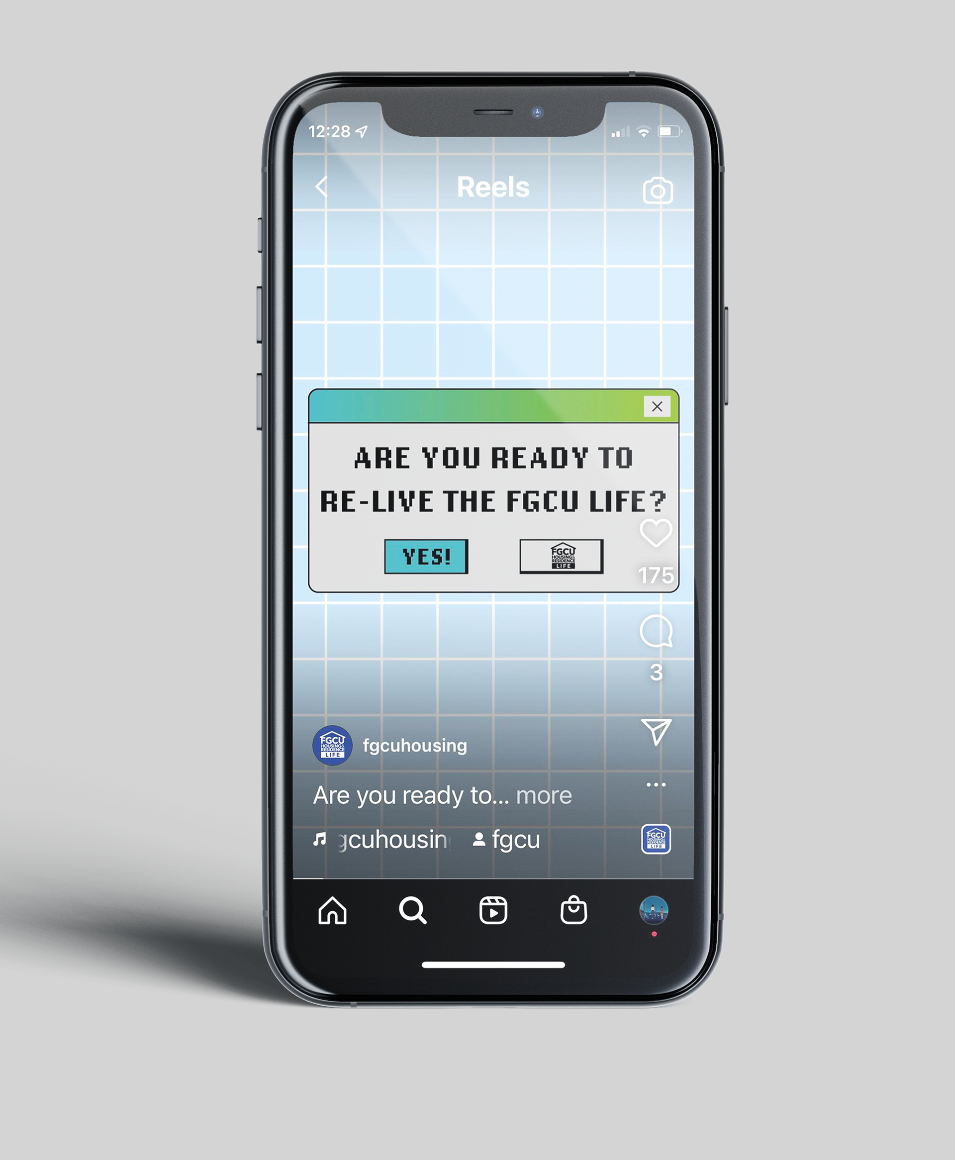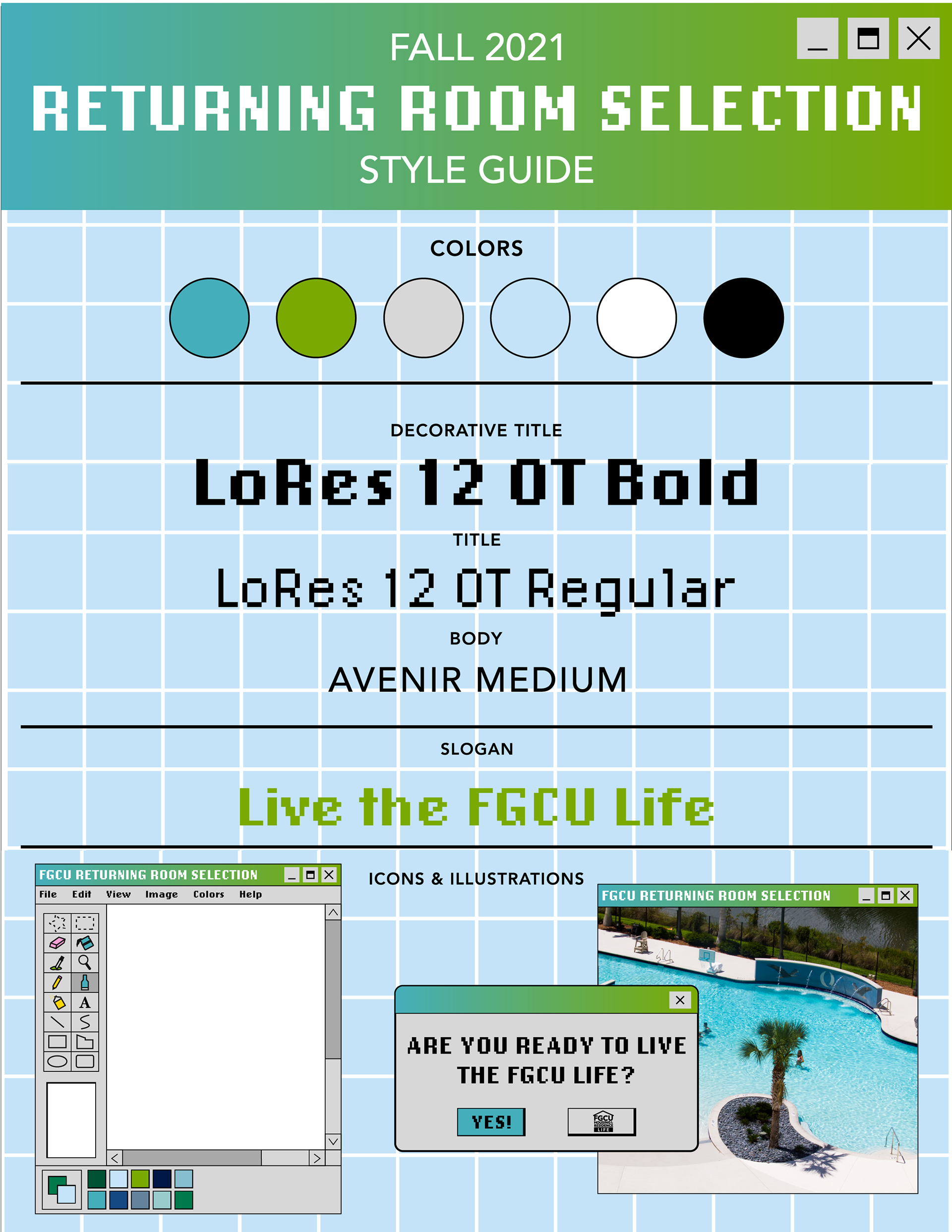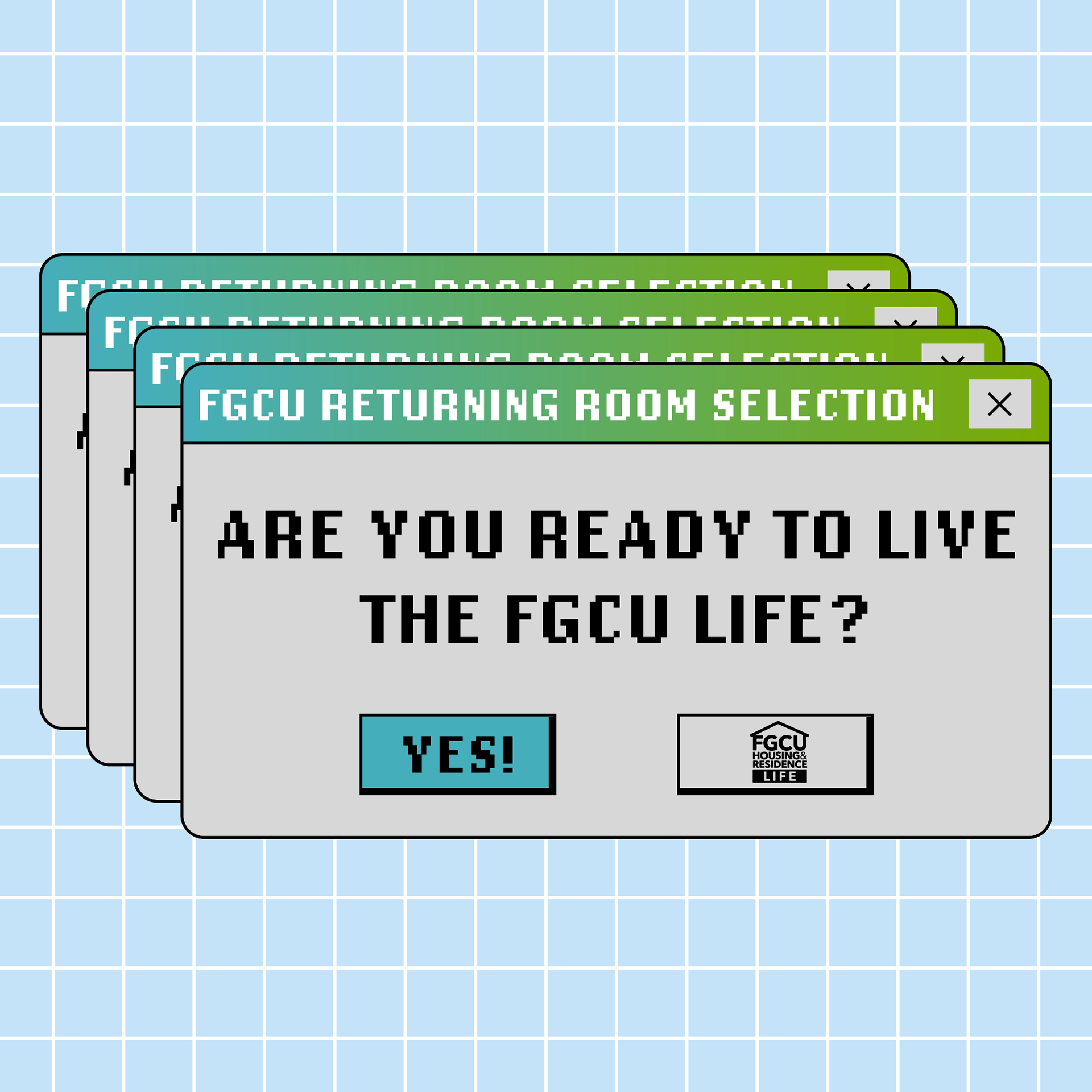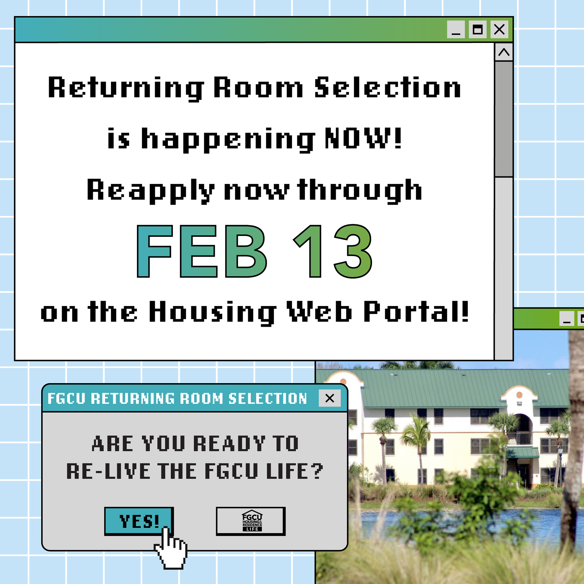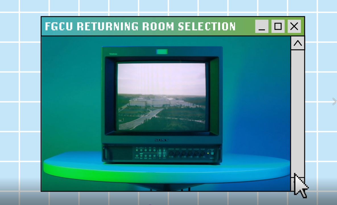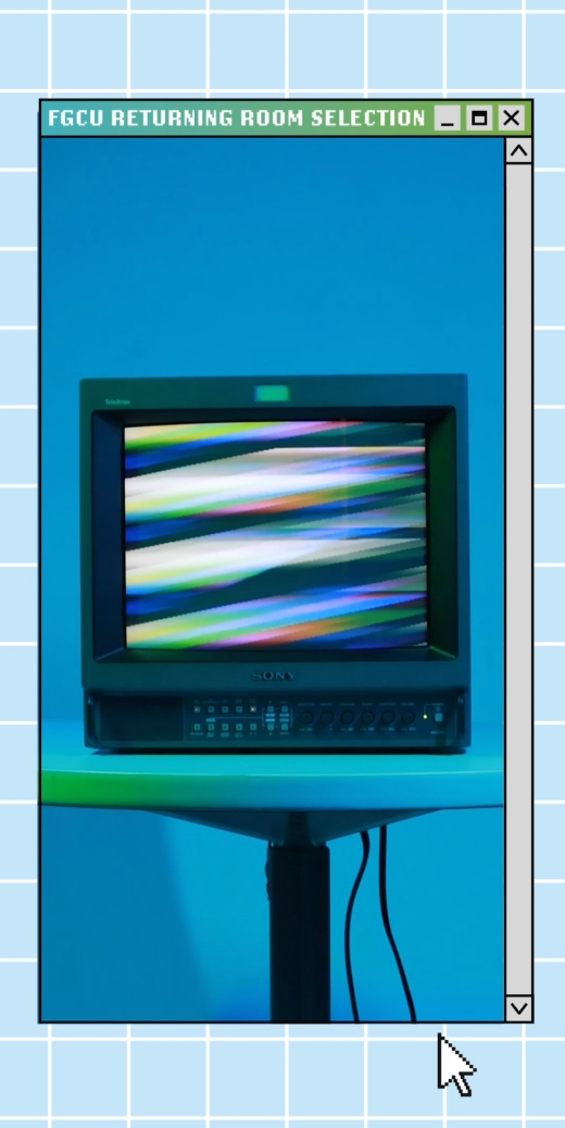 This marketing campaign was a collaborative project with the FGCU Housing Marketing Team. This campaign is directly inspired by Windows XP and analog television sets based on current trends of nostalgia and early internet design that are popular among the college-age target audience. This aesthetic was chosen to create visual interest and catch the attention of students to promote current FGCU Students to return to on-campus housing. The designs were created using University branding guidelines and utilized Adobe Illustrator, After Effects, and Premiere Pro to create unique designs for Instagram Reels and Facebook videos.