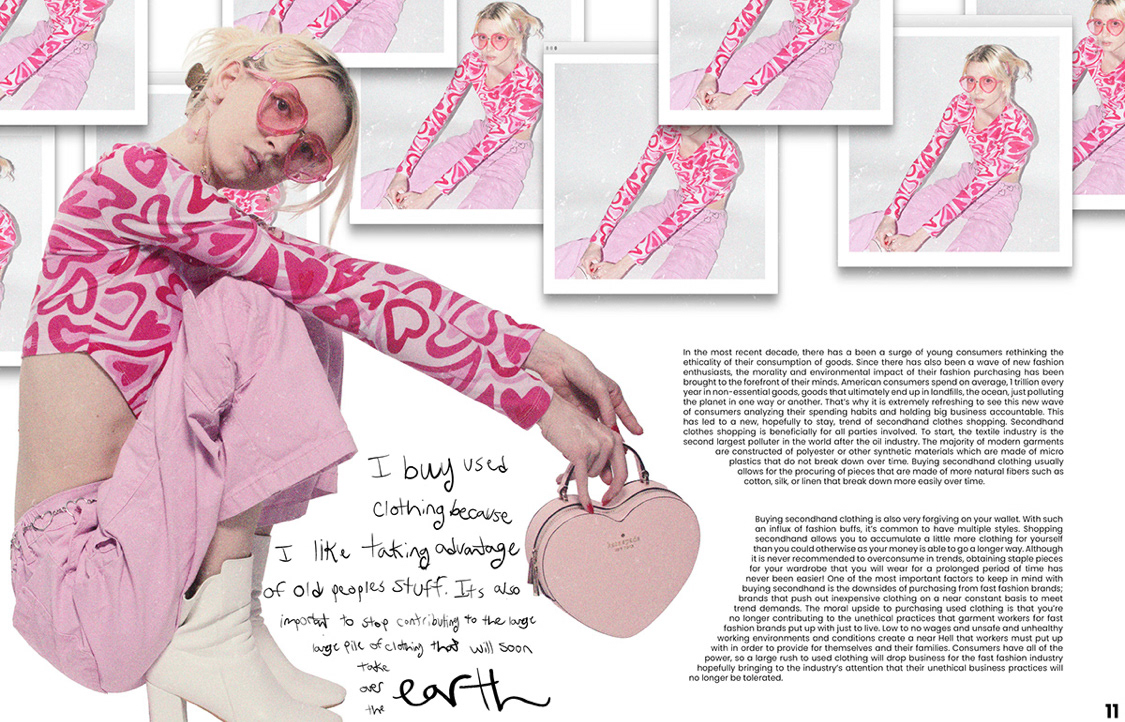 Worked closely with the editorial designer to curate sustainable clothing for each photoshoot. Assisted with photoshoot setup as well as modeling for the sustainable fashion pieces. Photography and Editorial Design by Ashley Papp.